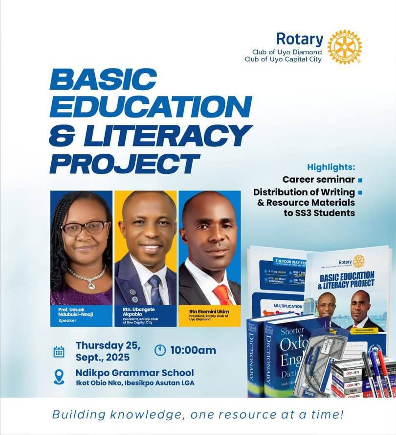 In the Rotary Calendar, September is designated as the month for Basic Education and Literacy Programs. On Thursday, September 18, the Rotary Clubs of Uyo Capital City and Uyo Diamond, led by their presidents, Ekemini Ukim and Ubongete Akpabio, donated essential school supplies, including exercise books, to Ndikpo Grammar School in the Ibesikpo Asutan local government area as part of their commitment to Basic Education and Literacy.